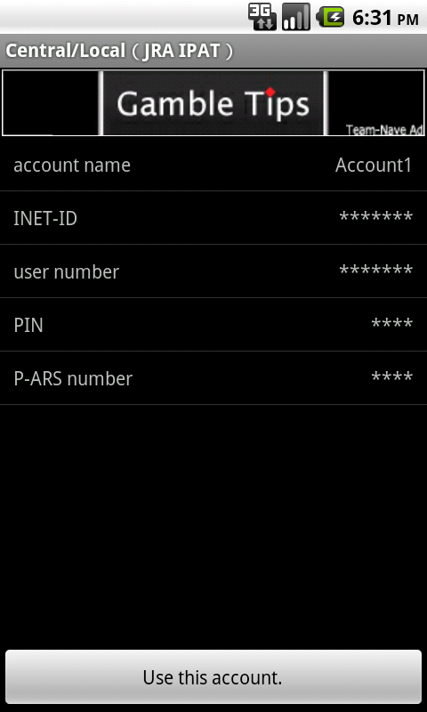 "OneTapLogin@Gamble" is an application which saves login information and can log in to the vote site of a municipally operated race by a one tap. Login information is attached to each vote site, and can be saved to five. The vote site which can be used now is as follows. - Central (JRA-IPAT) - Local (JRA-IPAT) - South-Kanto (SPAT4) - boat race - keirin - autorace When this application is used, not all responsibility carries out whether he would like to produce now [ negative ] to all problems, such as becoming damage, an obstacle, etc. Screen images of "OneTapLogin@Gamble" for Android