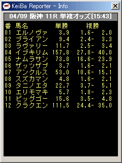 単勝、馬連オッズを表示できます。当然リアルタイムに更新表示を行います。 |