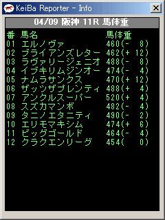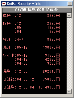 | KeiBa Reporter(以下KBR)は、レースの発走時刻や馬体重、払戻金などをリアルタイムにお知らせする、競馬リアルタイム報告ソフトウェアです。 チェックしたい競走馬、騎手なども登録でき、ニュースやオッズまでもリアルタイムに知ることができます。 環境設定により、お知らせ機能を細かく設定でき、メッセージの位置やサウンドのありなしも設定可能です。 |
