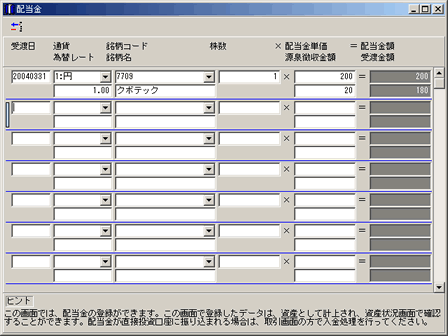 ![]() 配当金を登録できます。(資産として計上するため) ここで登録したデータは、資産状況や資産チャートに反映されます。 |