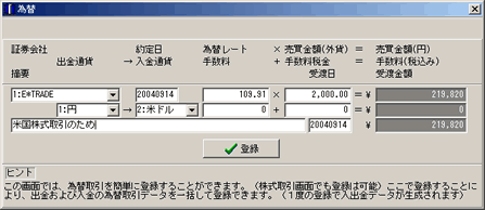 ![]() 為替取引を簡単に登録できます。(円で米ドルの購入など) 海外株式取引のために必要になります。 |