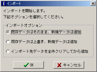 | KSTMSの導入方法として、現在のお客様の状況からいくつかの導入パターンが考えられます。パターンごとに順を追ってご説明致します。 <全パターン共通の準備処理> どのパターンにおいても、まずはじめに確認および設定しておいてただく必要があるものです。 [ 1]KSTMSを起動してください。 「スタート」メニューの「プログラム」よりインストール時に指定 したフォルダ(デフォルトでは「team-nave」-「KSTMS」)を選択し、「KabuShiki Trade Management System」を選択します。 [ 2]「取引」メニューから「メンテナンス」を選択します。 メンテナンス画面が表示されます。 [ 3]「証券会社」タブが選択されているはずですので、E*TRADE以外の証券会社で取引される場合は、その分だけ追加してください。よく使う証券会社は、ソート文字列を000にするとデフォルトで選択されるようになります。 ※最初から登録されているデータのコードは変更しないでください。(例:E*TRADEは証券会社コード1のままにしておいてください) [ 4]「通貨」タブを選択し、円および米ドル以外で取引される場合は、その分だけ追加してください。 ※最初から登録されているデータのコードは変更しないでください。 [ 5]メンテナンス画面を閉じてください。 以上で準備は終わりです。 以降は各パターンの説明へ進んでください。 →パターンA:取引データが全て揃っている場合 →パターンB:取引データを全て手入力する場合 →パターンC:途中からの取引データで導入する場合 <パターンA:取引データが全て揃っている場合> このパターンはもっとも簡単に導入できるパターンです。 [ 1]E*TRADE証券の約定履歴CSVファイルもしくは取引データCSVファイルを準備します。 [ 2]証券用口座への初回入金分の取引を登録します。(※手順[ 1]にあるCSVファイルに初回入金データがある場合は、ここで登録する必要はありません。ただし、E*TRADEの場合は、入出金データは約定履歴データとは別になっているため、ここで登録していただく必要があります。) (イ)「取引」メニューから「株式売買」を選択します。 (ロ)株式売買画面が表示されますので、画面上部の年度、証券会社および通貨を選択してください。 ※通貨は環境設定で「国外での取引を行う」にチェックを入れている場合のみ選択できます。 (ハ)続いて、入金取引として以下のように入力します。 ![]() (ニ)株式売買画面を閉じてください。 [ 3]「ファイル」メニューから「インポート」を選択します。 [ 4]準備しておいたCSVファイルを選択します。ファイルが複数ある場合は、一度にひとつのファイルずつ処理しますので、古いものから順に選択してください。(正確にはどの順番でインポートしても、後から更新処理をやり直すことができますので、特に問題はありません) [ 5]もしE*TRADE証券の約定履歴データであれば、確認メッセージが表示されますので、「OK」をクリックして、インポートを開始します。 その他の取引データであれば、インポートオプションの確認画面が表示されますので、「既存データはそのまま、新規データは追加」を選択し、「OK」をクリックします。 ![]() [ 6]すべての取引データのインポートが終われば、導入処理は終わりです。当ページ最下部にある、<最終確認>をご参照の上、データと実際の持ち株および残高に間違いがないかどうかご確認ください。 <パターンB:取引データを全て手入力する場合> 手入力は少し大変ですが、入力の手間を削減できるような機能が盛り込まれています。また全取引データを入力するとデータの辻褄が合いますので、問題が起こることも少ないはずです。 [ 1]取引手数料の入力を簡略化できます。まずはじめに証券会社に合わせた取引手数料をメンテナンスします。(E*TRADE証券の手数料は設定済み) (イ)「取引」メニューから「メンテナンス」を選択します。 (ロ)メンテナンス画面が表示されますので、「取引手数料」タブを選択します。 (ハ)E*TRADE証券の手数料がはじめに画面に表示されますので、だいたいどのように入力すれば良いかの要領をつかんでください。 (ニ)証券会社、通貨および手数料種別を選択してください。 (ホ)必要な条件および手数料を入力してください。 (ヘ)全ての必要な取引手数料の入力が終われば、メンテナンス画面を閉じてください。 [ 2]証券用口座への初回入金分の取引を登録します。 (イ)「取引」メニューから「株式売買」を選択します。 (ロ)株式売買画面が表示されますので、以下のように入力します。 ![]() [ 3]続けて、株式の売買取引を登録します。 (イ)株式売買画面で、約定日を入力します。Enterキーを押すと、次の項目に移動します。取引Noは自動でセットされます。 (ロ)銘柄コードを入力し、Enterを押し、銘柄名を入力し、Enterを押します。 ※一度銘柄コードおよび銘柄名を登録すると、次の取引データの入力より、コンボボックスから銘柄を選択できるようになります。 (ハ)取引種別を選択します。慣れてくればコード入力により、